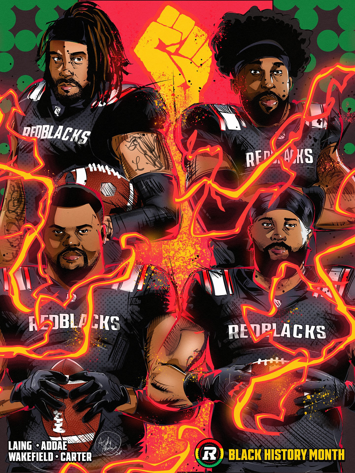 There’s courage in stepping onto the field, in carrying legacy, in performing under pressure. I wanted to translate that energy visually with the Canadian Football League's REDBLACKS. The composition leans into motion and impact, with kinetic bursts of Pan-African colours (greens, reds and yellow) scattered as tiny dots across the frame. Those fragments build and crescendo into a fist exploding with energy at the center, symbolizing unity, resilience, and collective strength.